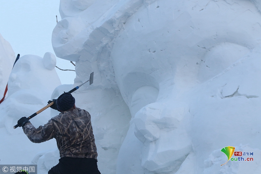 2018年12月13日,黑龍江省哈爾濱市,國內(nèi)最大的雪雕盛會(huì)太陽島雪博會(huì)正在緊鑼密鼓建設(shè)中,部分雪雕雛形已現(xiàn),雪雕師正在精雕細(xì)刻打磨中。