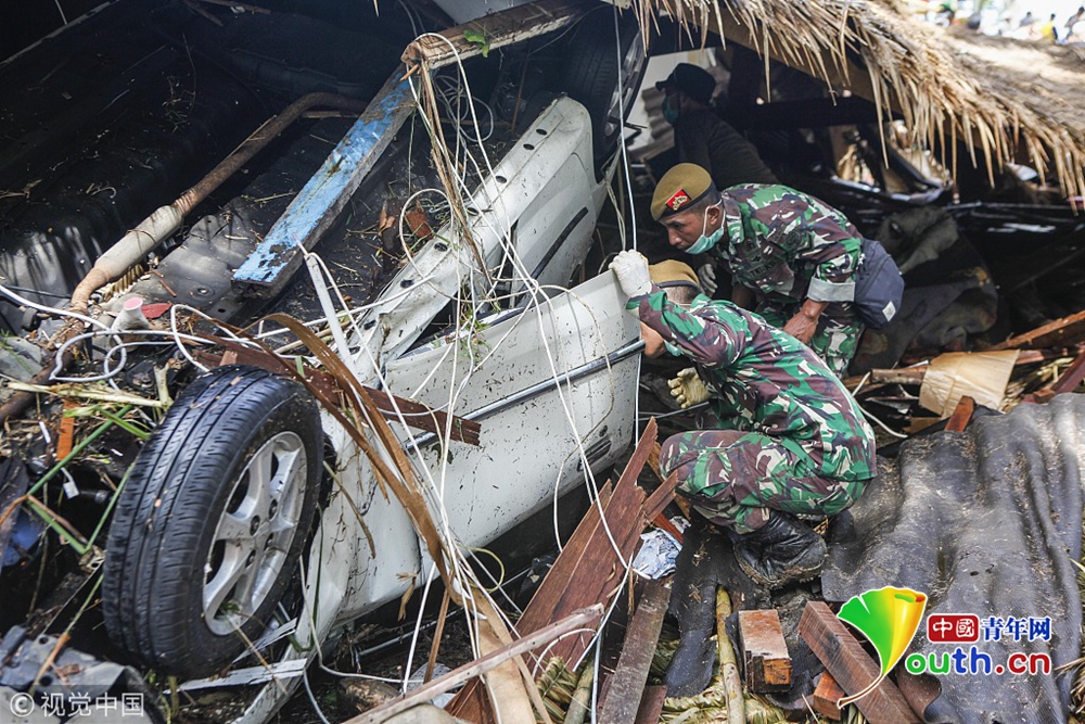 12月24日,受災(zāi)民眾在印尼萬(wàn)丹省海嘯災(zāi)區(qū)進(jìn)行清理工作。 印度尼西亞抗災(zāi)署發(fā)言人24日說(shuō),印尼西部巽他海峽海嘯死亡人數(shù)已經(jīng)上升至373人。 新華社記者 張可任 攝