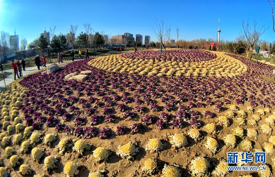 12月24日,游人在北京玉淵潭公園觀賞甘藍(lán)。 日前,北京市玉淵潭公園移栽的三萬(wàn)多棵紫色和黃色羽衣甘藍(lán)盛開,為冬季公園增添了色彩。 新華社記者李欣攝