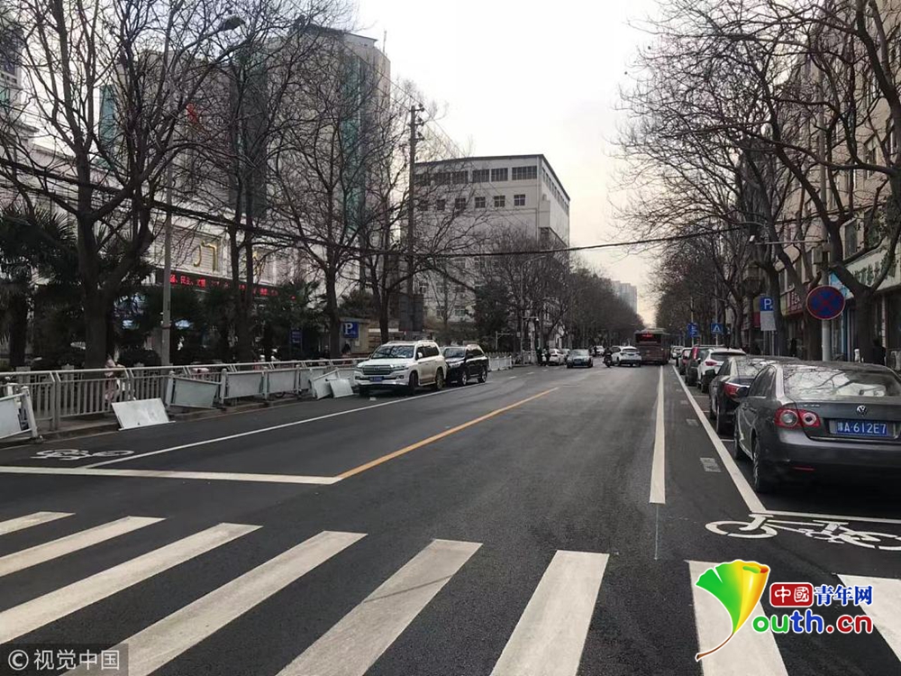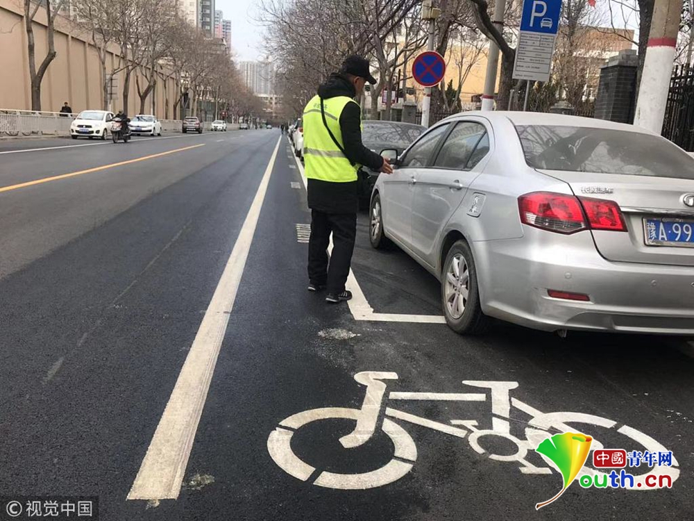 現(xiàn)場,文化宮路與友愛路口附近,新鋪好的路面被劃上了嶄新的行車線和停車位標線。從文化宮路和友愛路交叉口向北,道路東側的非機動車道被停車位占去后,僅剩下0.8米左右的寬度。同樣在路口南側,道路西側的非機動車道也被新劃的停車位占去,僅剩不足1米的寬度。