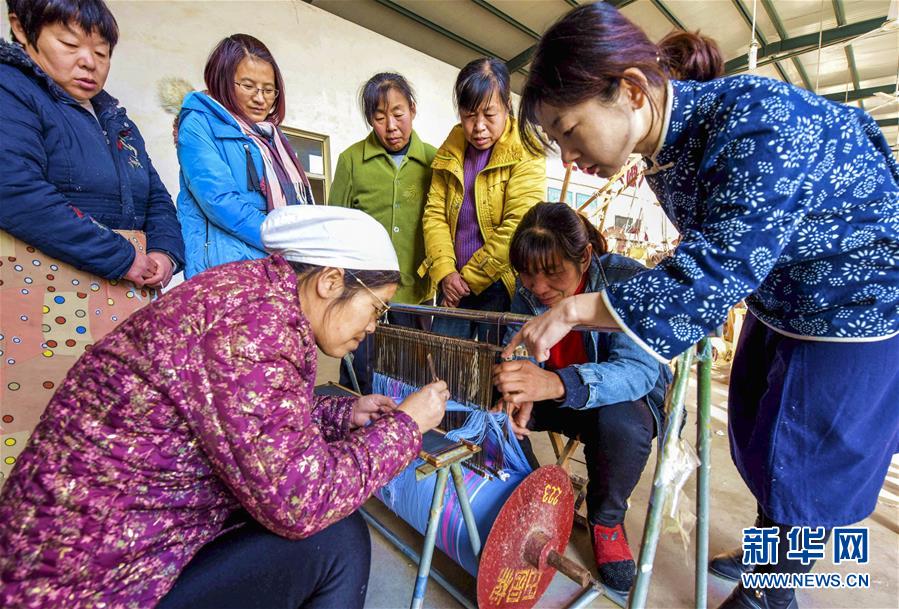 12月25日,在衡水市冀州區(qū)一家老粗布生產(chǎn)企業(yè),田園棉手織粗布傳承人(右一)在指導村民學習田園棉手織粗布技藝。 2018年以來,河北省衡水市冀州區(qū)依托當?shù)氐氖〖壏沁z田園棉手織粗布技藝資源,采取“非遺+扶貧”的模式,通過非遺傳承人開展技能培訓、老師傅傳幫帶等,讓貧困村民在傳承非遺文化的同時學習傳統(tǒng)技藝,助力脫貧致富。 新華社記者 李曉果 攝