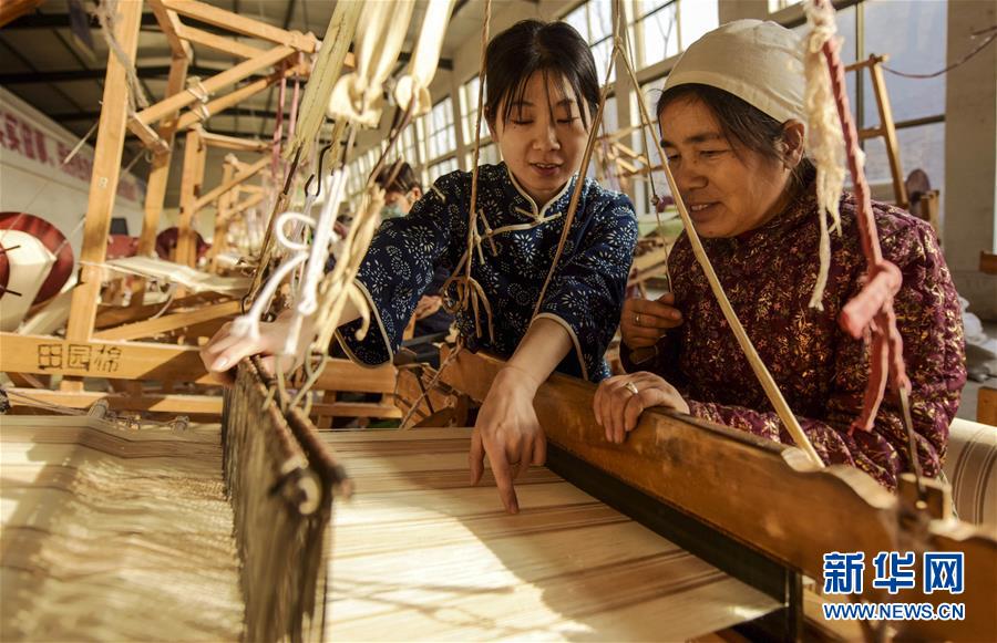 12月25日,在衡水市冀州區(qū)一家老粗布生產(chǎn)企業(yè),田園棉手織粗布傳承人(左)在指導村民織布。 2018年以來,河北省衡水市冀州區(qū)依托當?shù)氐氖〖壏沁z田園棉手織粗布技藝資源,采取“非遺+扶貧”的模式,通過非遺傳承人開展技能培訓、老師傅傳幫帶等,讓貧困村民在傳承非遺文化的同時學習傳統(tǒng)技藝,助力脫貧致富。 新華社記者 李曉果 攝