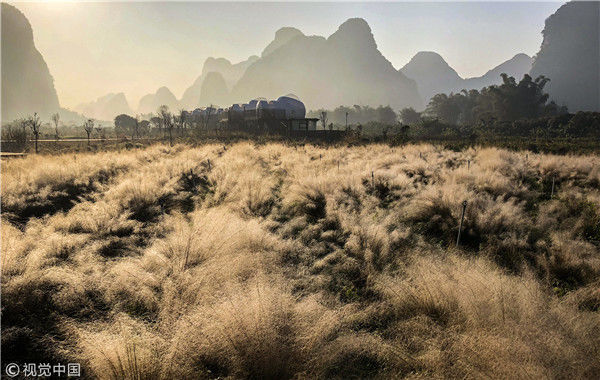 2018年12月18日,廣西桂林,陽(yáng)朔縣遇龍河畔。晨光中的泡泡屋配套景觀——粉黛子。