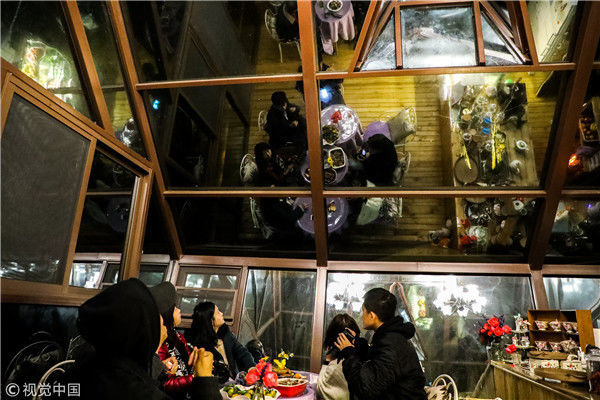2018年12月17日,廣西桂林,陽朔縣遇龍河畔。夜色中的泡泡屋觀景臺。