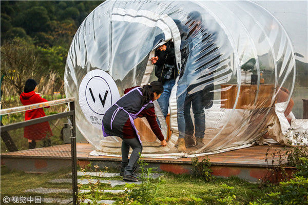 2018年12月17日,廣西桂林,陽朔縣遇龍河畔。主人引領游客走進泡泡屋。