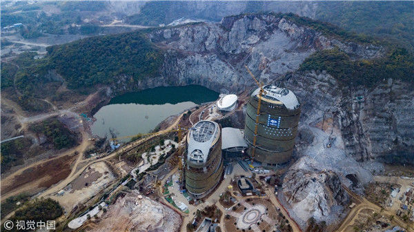 2017年11月15日,航拍南京老山一處百米懸崖邊,拔地而起的在建酒店酷似兩個(gè)“外星人基地”。
