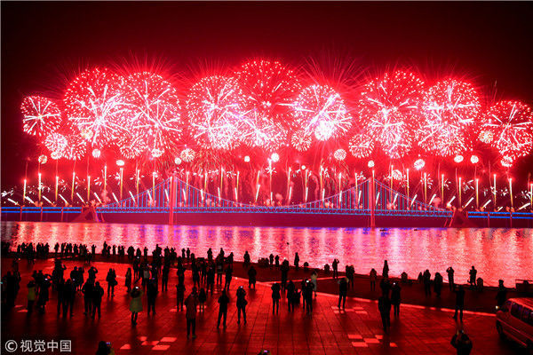 2017年12月31日,大連首次在星海灣跨海大橋上燃放煙花迎接新年的到來,璀璨的煙花在大連星海灣上空綻放。