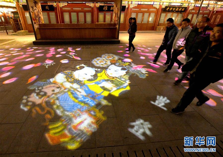 12月4日,游客在楊柳青古鎮(zhèn)步行街上欣賞年畫(huà)主題燈光。 近日,天津市西青區(qū)楊柳青古鎮(zhèn)在步行街新增9組以楊柳青年畫(huà)代表作為主題的動(dòng)態(tài)夜景燈光,講述古鎮(zhèn)與年畫(huà)的歷史。 新華社記者 岳月偉 攝