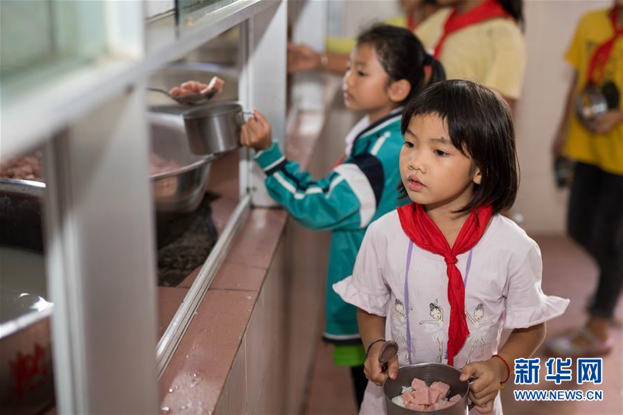 在云南省金平苗族瑤族傣族自治縣者米鄉(xiāng)中心小學(xué),孩子們在食堂打飯,準(zhǔn)備吃營養(yǎng)晚餐(11月13日攝)。新華社記者 胡超 攝
