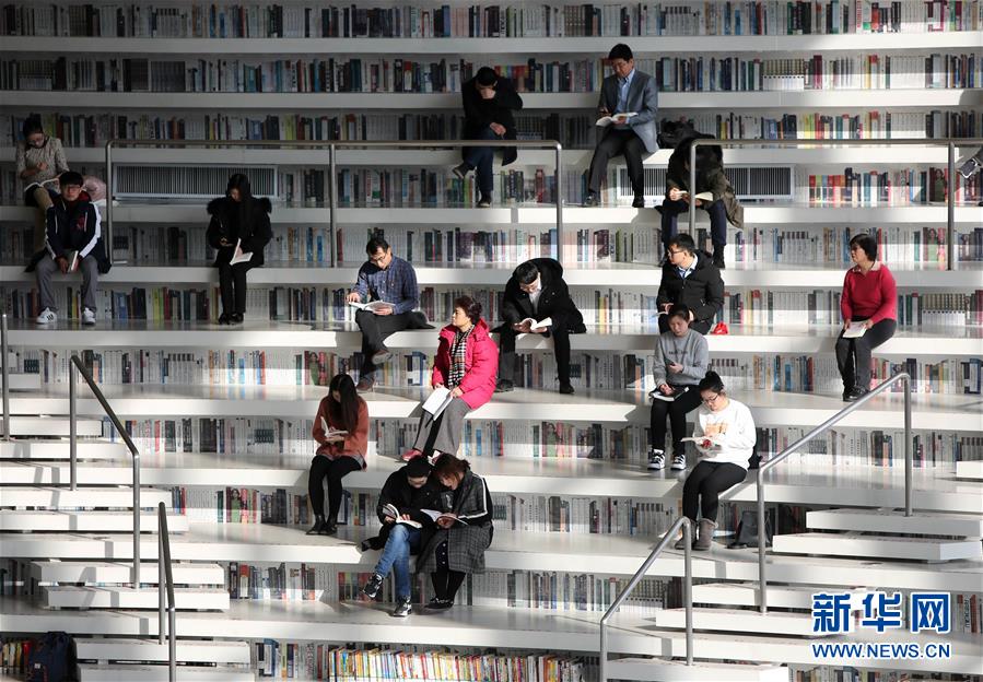 12月27日,讀者在天津濱海新區(qū)圖書館中庭的“書山”上看書。 濱海新區(qū)圖書館位于天津濱海文化中心,2017年10月1日正式開館,設(shè)計立意為“濱海之眼”和“書山有路勤為徑”。圖書館現(xiàn)有藏書60多萬冊,一年多來接待讀者約280萬人次,已成為濱海新區(qū)的文化“新地標”。 新華社記者伍婧丹攝