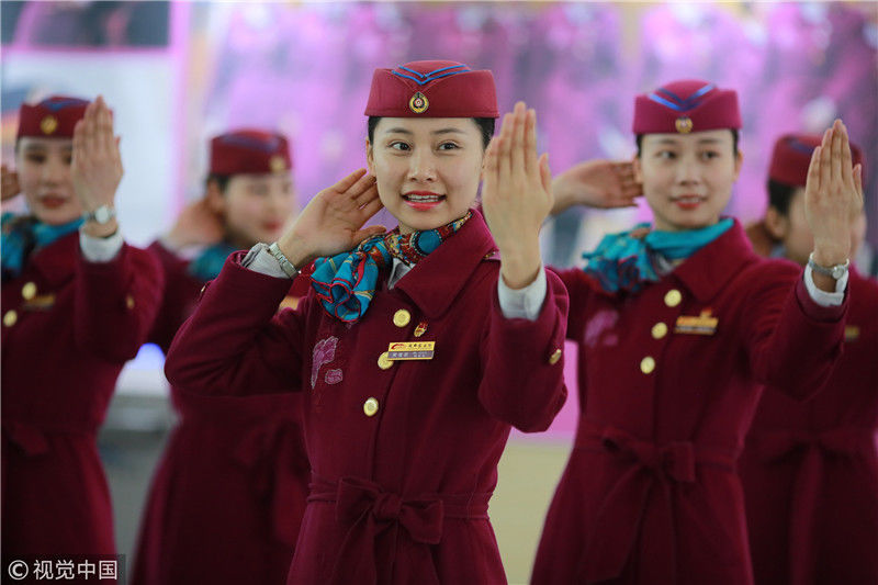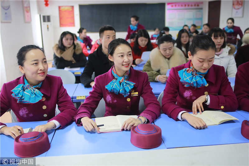 2018年12月27日,四川成都,為備戰(zhàn)即將開通的成雅鐵路,中國鐵路成都局集團(tuán)有限公司成都客運(yùn)段動(dòng)車二隊(duì)對成雅動(dòng)車的乘務(wù)人員進(jìn)行理論、形體、服務(wù)禮儀等內(nèi)容的培訓(xùn)。蘇志剛/視覺中國