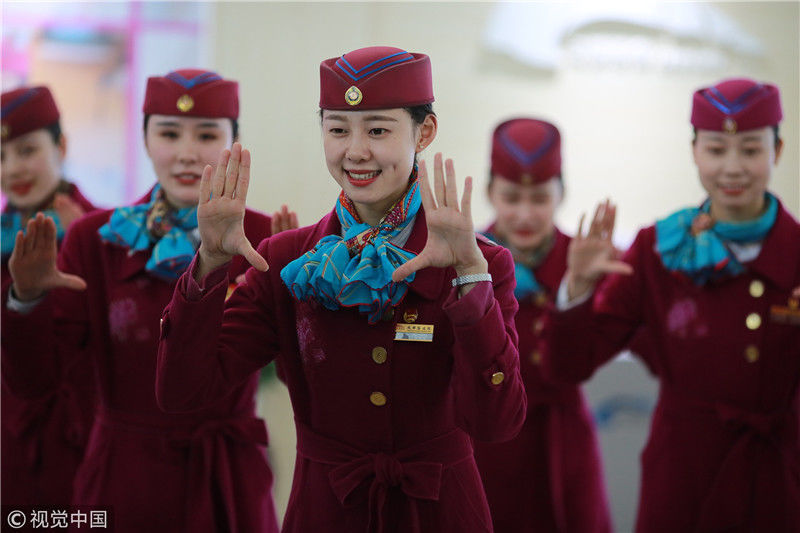 2018年12月27日,四川成都,為備戰(zhàn)即將開(kāi)通的成雅鐵路,中國(guó)鐵路成都局集團(tuán)有限公司成都客運(yùn)段動(dòng)車二隊(duì)對(duì)成雅動(dòng)車的乘務(wù)人員進(jìn)行理論、形體、服務(wù)禮儀等內(nèi)容的培訓(xùn)。