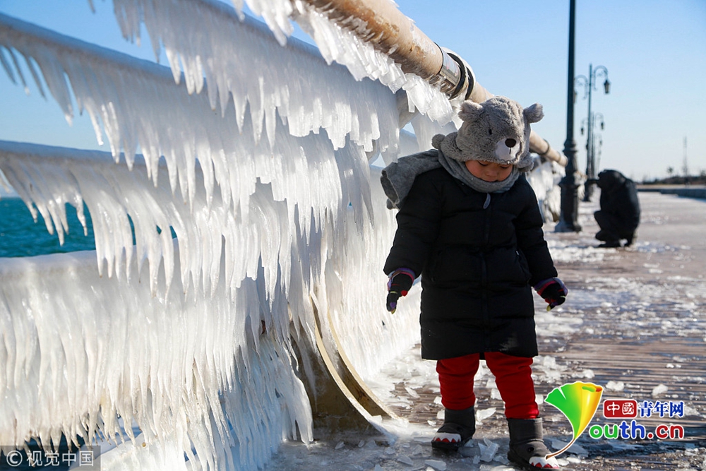 渤海大連北部海域潮水涌上岸邊,在堤壩的護欄上凝結(jié)成千姿百態(tài)的冰凌奇觀。