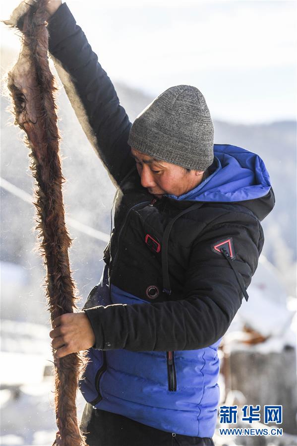 在新疆布爾津縣禾木村的一處冬季牧場,森格爾在挑選馬小腿部位的毛皮,用于制作毛皮滑雪板(1月3日攝)。新華社記者 胡虎虎 攝