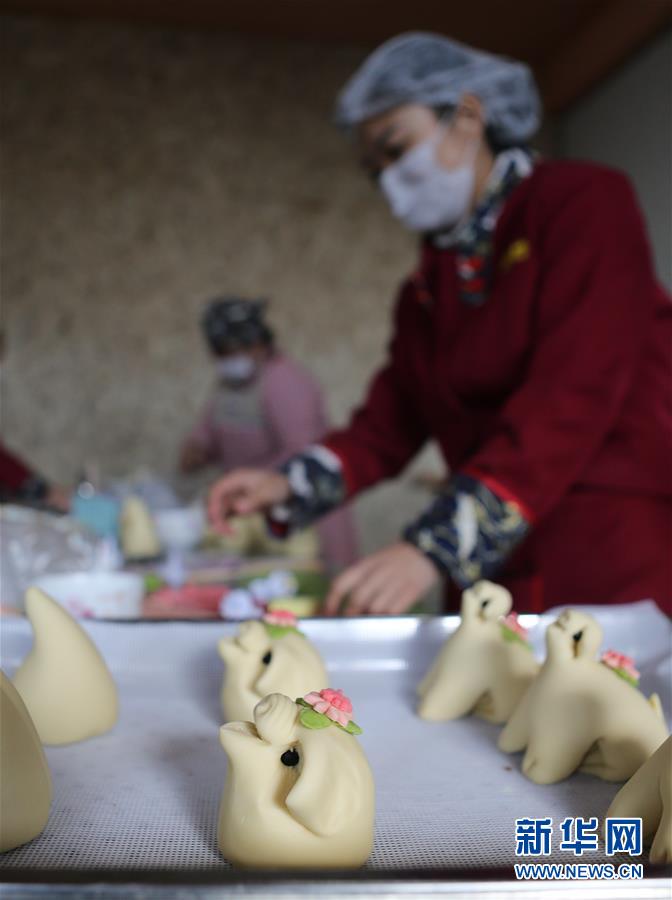 1月8日,工作人員準(zhǔn)備將做好的花餑餑放入蒸箱。 新華社記者 李紫恒 攝