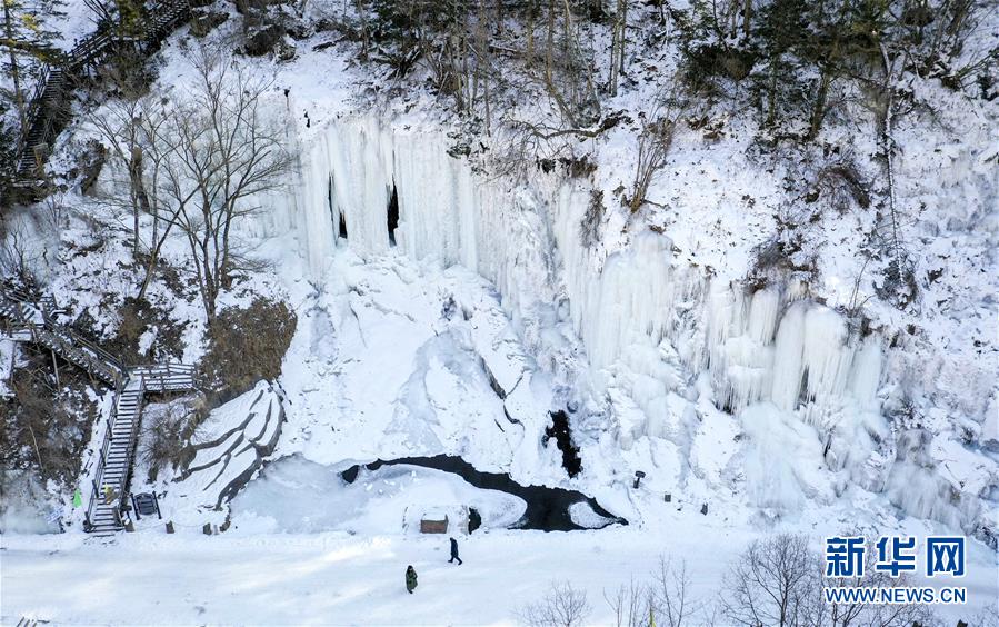 游人在吉林省長白縣十五道溝望天鵝景區(qū)觀賞冰瀑景觀(1月3日無人機(jī)拍攝)。新華社記者許暢攝