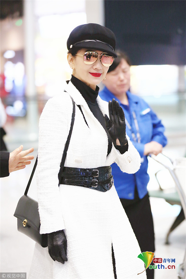 1月10日,廣東省深圳市,趙雅芝夫婦現(xiàn)身深圳寶安機(jī)場,頭戴貝雷帽的她架著反光墨鏡,一襲白色不規(guī)則連衣裙配上黑色腰封及皮靴,酷似甜美女教官!