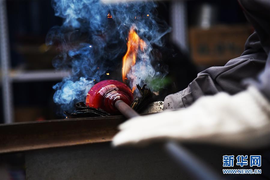 1月12日,孫云毅在吹制雞油黃琉璃藝術(shù)品。