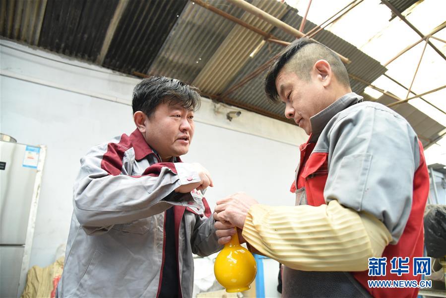 1月12日,孫云毅(左)在和工人交流一只雞油黃琉璃藝術(shù)品的打磨工藝。  新華社記者王凱攝