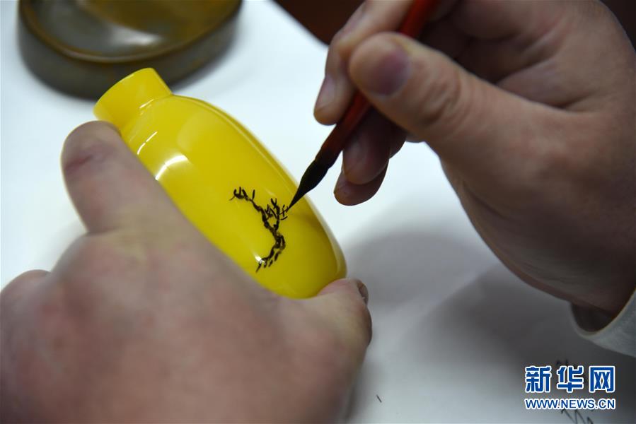 1月11日,孫云毅在為一只雞油黃鼻煙壺作畫。  新華社記者王凱攝