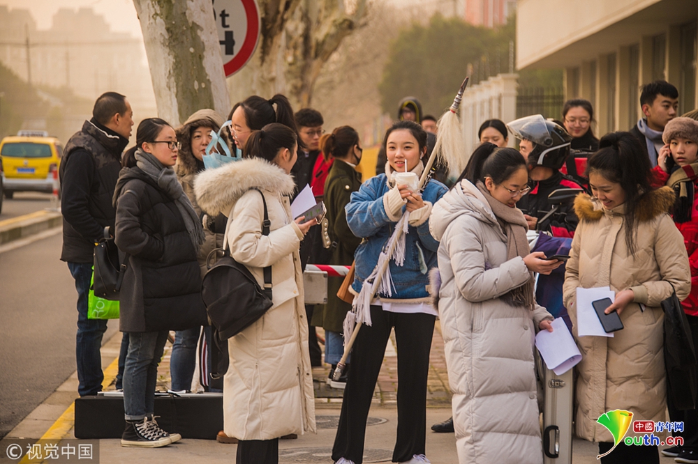 2019年1月14日,上海,上戲“藝考”第一階段第一天,不少考生從全國(guó)各地趕來,有的帶著樂器,有的帶著“刀槍”,在考點(diǎn)門口候考時(shí),還不時(shí)地練習(xí)下。