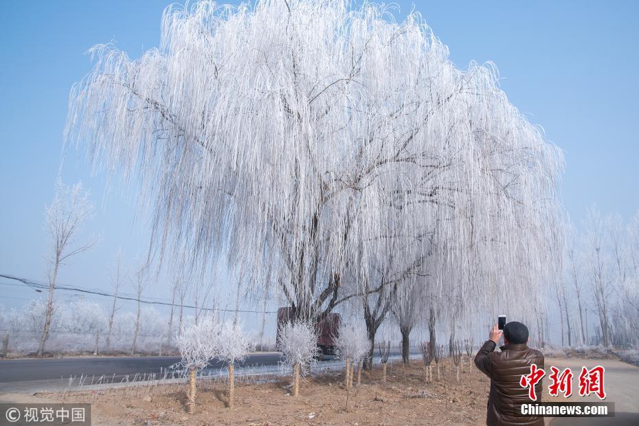 1月13日,107國(guó)道河北省定州路段出現(xiàn)霧凇(樹(shù)掛)景觀,吸引路人駐足拍照留念。王保生 攝 圖片來(lái)源:視覺(jué)中國(guó)
