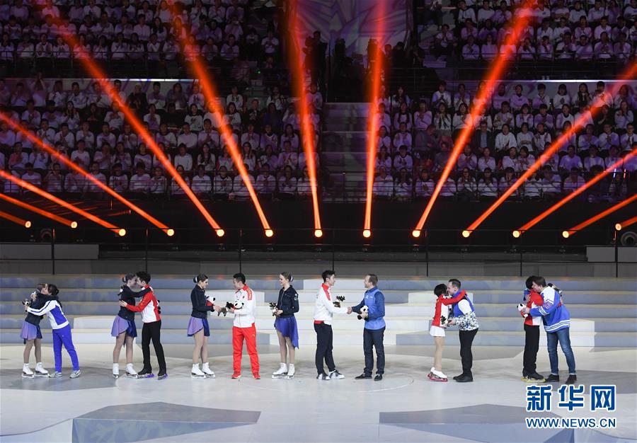 1月15日,中芬運動員代表互贈紀(jì)念品。 當(dāng)日,“2019中芬冬季運動年”開幕式在北京首鋼冰球館舉行。 新華社記者申宏攝