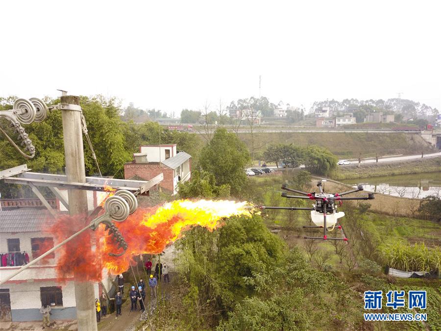 1月16日,噴火清障無人機(jī)在國網(wǎng)重慶永川供電公司無人機(jī)班操作手的控制下,對重慶市永川區(qū)大安街道小坎村10千伏隆安線16號桿處的一個馬蜂窩進(jìn)行噴火清除(無人機(jī)航拍)。 1月16日,經(jīng)過3年多的研發(fā)和測試,重慶首臺噴火清障無人機(jī)在國網(wǎng)重慶永川供電公司無人機(jī)班正式投用。這臺多旋翼無人機(jī),通過搭載帶有燃料箱、油泵、自動點(diǎn)火裝置的噴火吊艙任務(wù)模塊,可以對影響高空電力線路安全的飄掛物進(jìn)行定點(diǎn)障礙清除作業(yè)。 據(jù)噴火清障無人機(jī)研發(fā)負(fù)責(zé)人何濤介紹,過去高空清除異物主要靠人工進(jìn)行,為保證安全經(jīng)常需要停電作業(yè),因此他們結(jié)合實(shí)際工作經(jīng)驗(yàn)和高空電力線路的自身特點(diǎn),設(shè)計(jì)和制造出了噴火清障無人機(jī)。2018年測試期間,國網(wǎng)重慶永川供電公司無人機(jī)班在多種環(huán)境下成功執(zhí)行了50多次高空電力線路清障作業(yè)。 新華社記者 劉潺 攝