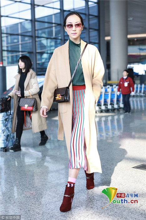 2019年1月17日,上海,韓雪現(xiàn)身機場,穿著條紋紗裙露出小腿,十分抗凍,她搭配經(jīng)典的駝色大衣,氣質(zhì)出眾在機場人群中相當搶鏡。
