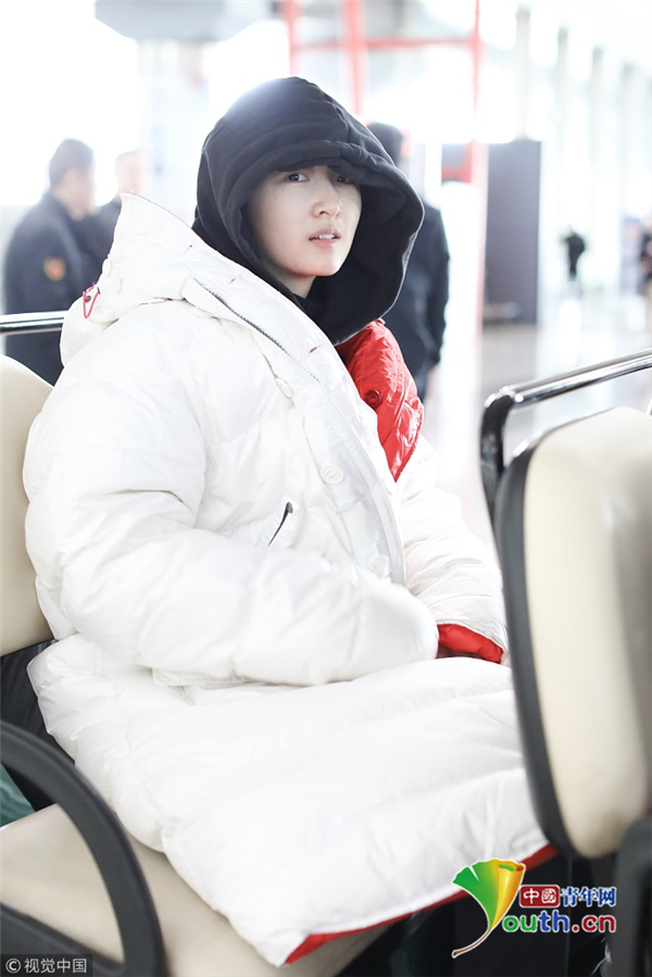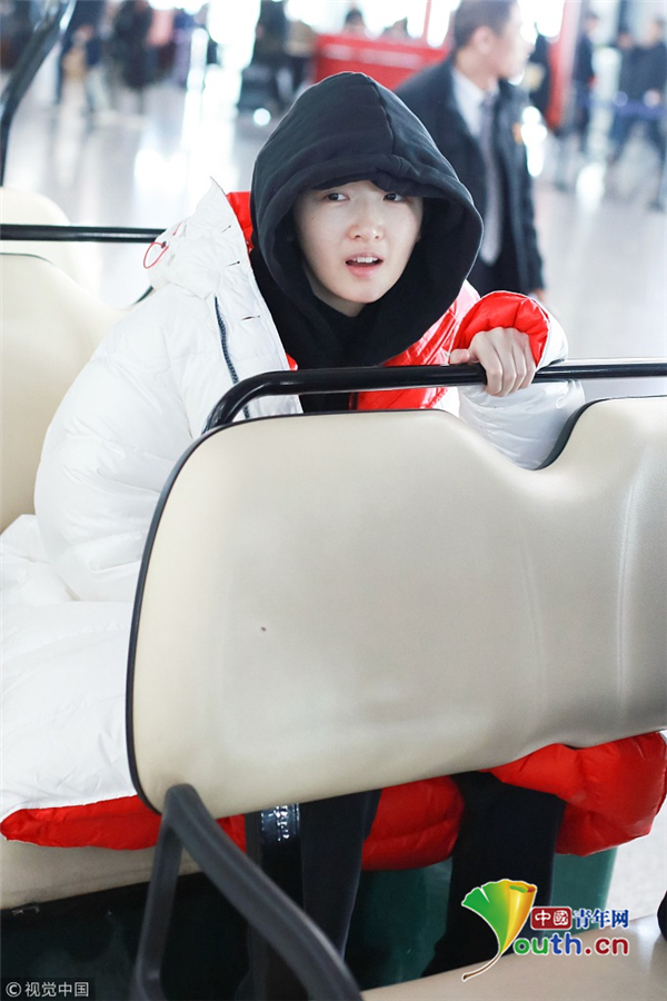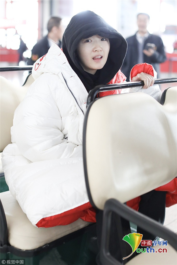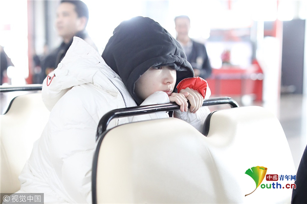 1月23日,北京,周冬雨現身機場。她用黑色連衣帽罩頭襯托巴掌臉,把下巴擱在行李車推桿上的雙手上呆萌可愛 。