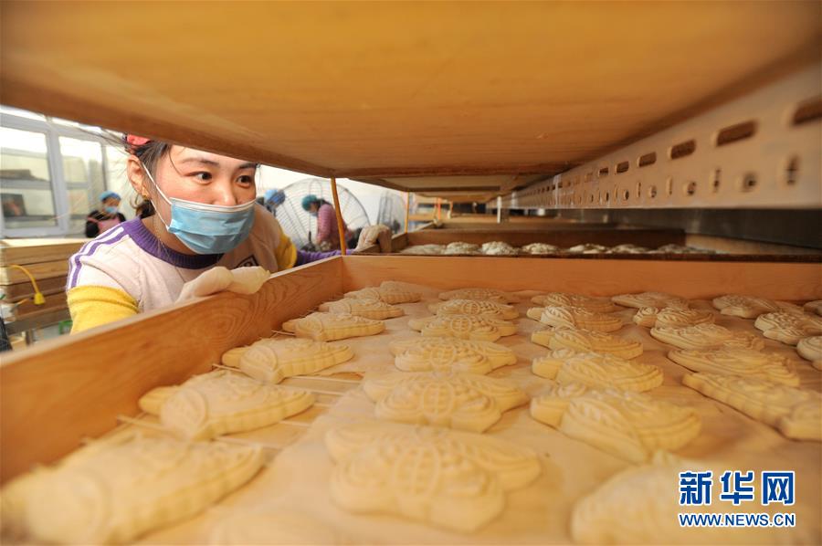 1月31日,河北黃驊市一家面花作坊的工人在查看面花。 河北黃驊市有著過年蒸面花的習俗。春節(jié)前夕,當?shù)孛婊ㄖ谱鞴S加班加點制作面花,供應春節(jié)市場。 新華社記者牟宇攝