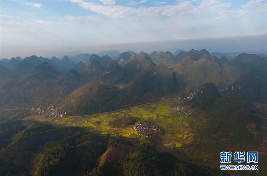 3月20日在貴州錦屏縣新化鄉(xiāng)拍攝的春景(無人機(jī)拍攝)。春分將至,貴州各地成片的油菜花漸次綻放,如同金色的地毯鋪上云貴高原。 新華社記者 歐東衢 攝