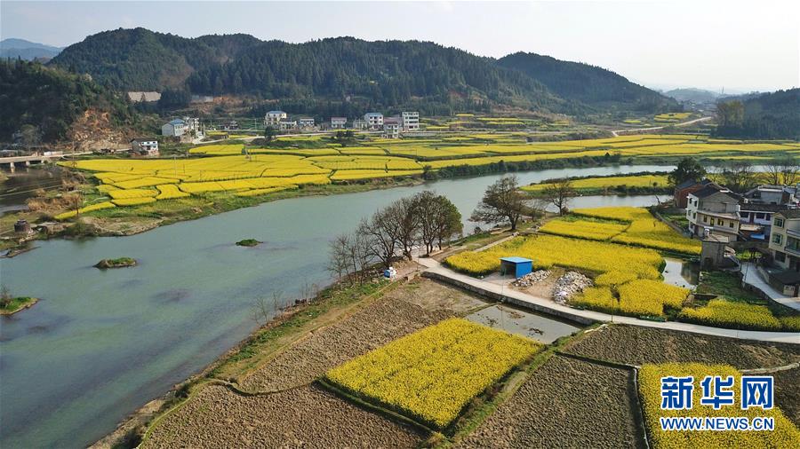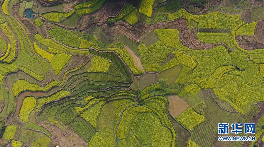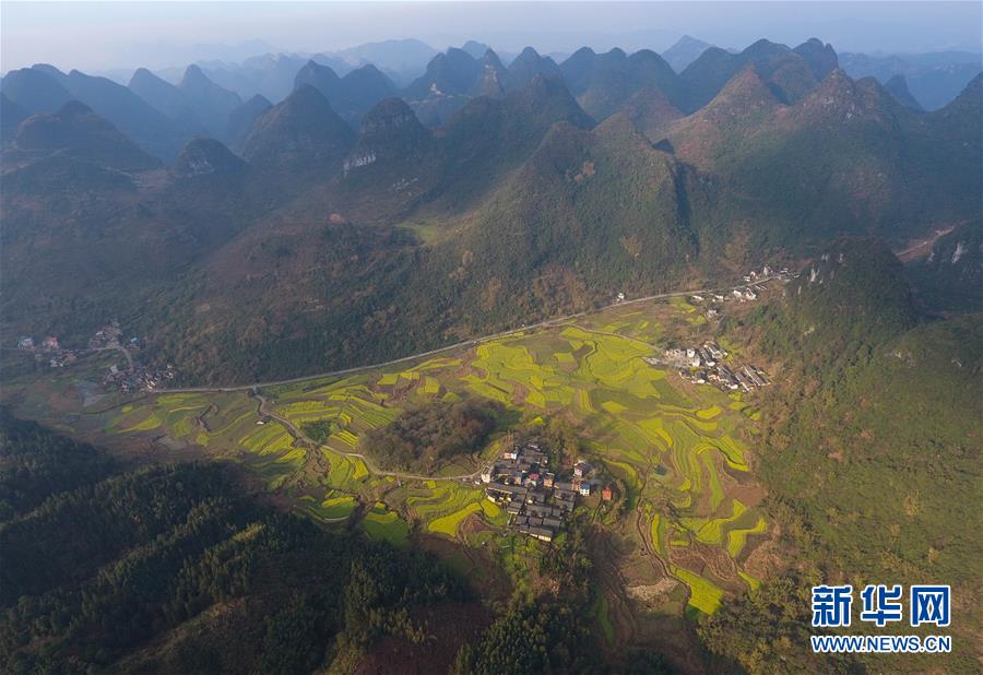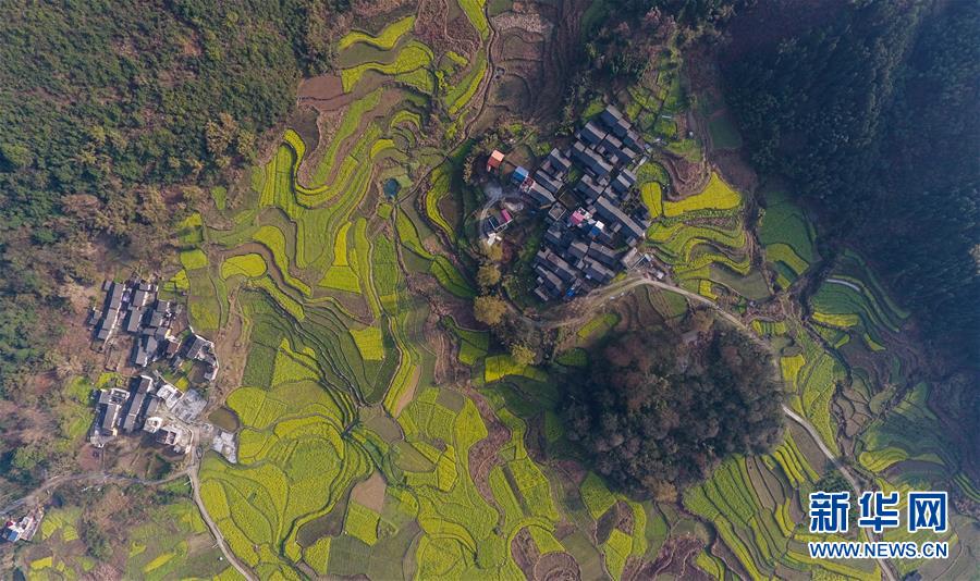 3月20日在貴州錦屏縣敦寨鎮(zhèn)拍攝的春景(無人機(jī)拍攝)。春分將至,貴州各地成片的油菜花漸次綻放,如同金色的地毯鋪上云貴高原。 新華社記者 歐東衢 攝
