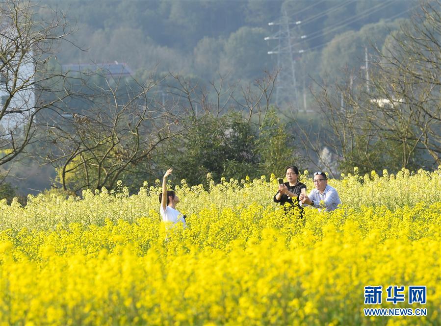 3月19日,游人在下涯鎮(zhèn)油菜花海中留影。近日,浙江省建德市下涯鎮(zhèn)油菜花盛開,吸引不少游客前來踏春。 新華社記者翁忻旸攝