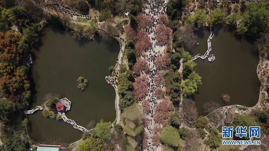 3月31日,游客在中國科學技術大學東區(qū)觀賞櫻花(無人機拍攝)。