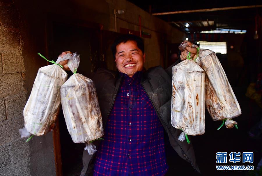 在廣西融水苗族自治縣桿洞鄉(xiāng)堯告村,貧困戶(hù)韋玉元在苗坪嶺藥材種植專(zhuān)業(yè)合作社里領(lǐng)取靈芝菌棒(3月11日攝)。