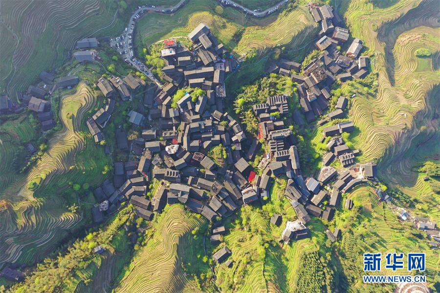 龍勝各族自治縣和平鄉(xiāng)平安村一景(4月7日無人機(jī)拍攝)。連日降雨過后,廣西龍勝各族自治縣和平鄉(xiāng)平安村的壯族村寨迎來久違的朝陽。 新華社記者 曹祎銘 攝