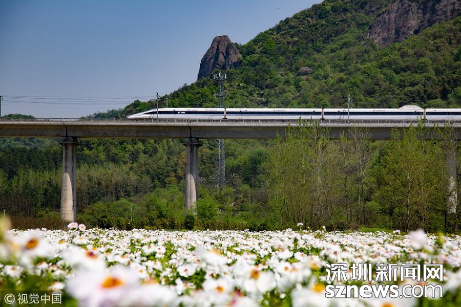 2019年3月22日,北京居庸關(guān)附近的山花盛開,S2線列車穿行在花海之中,構(gòu)成一幅美麗的畫面。