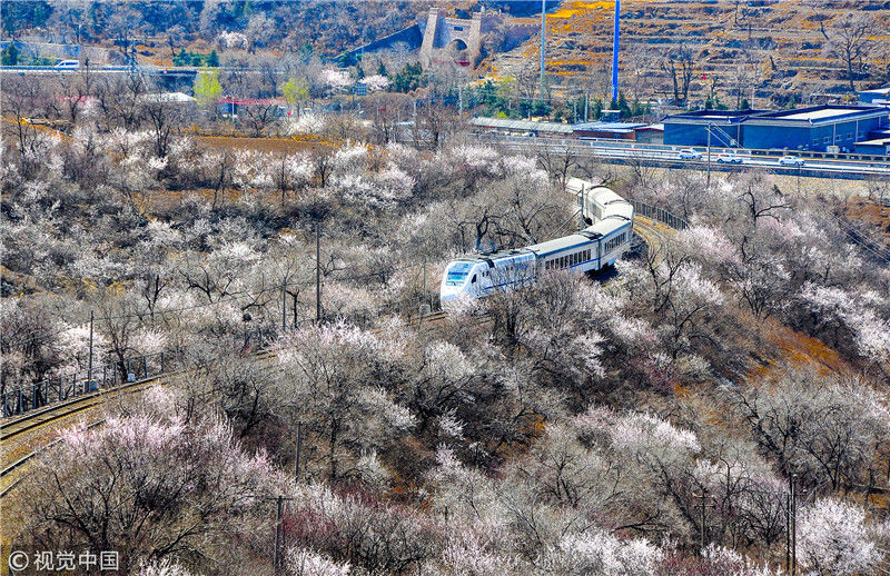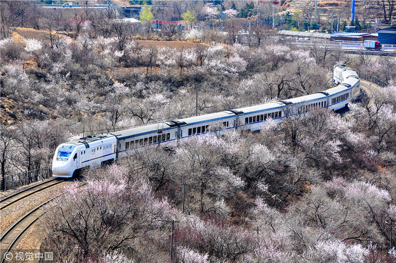 2019年3月22日,北京居庸關(guān)附近的山花盛開,S2線列車穿行在花海之中,構(gòu)成一幅美麗的畫面。時(shí)永平/千龍圖像/視覺中國 編輯/陳進(jìn)
