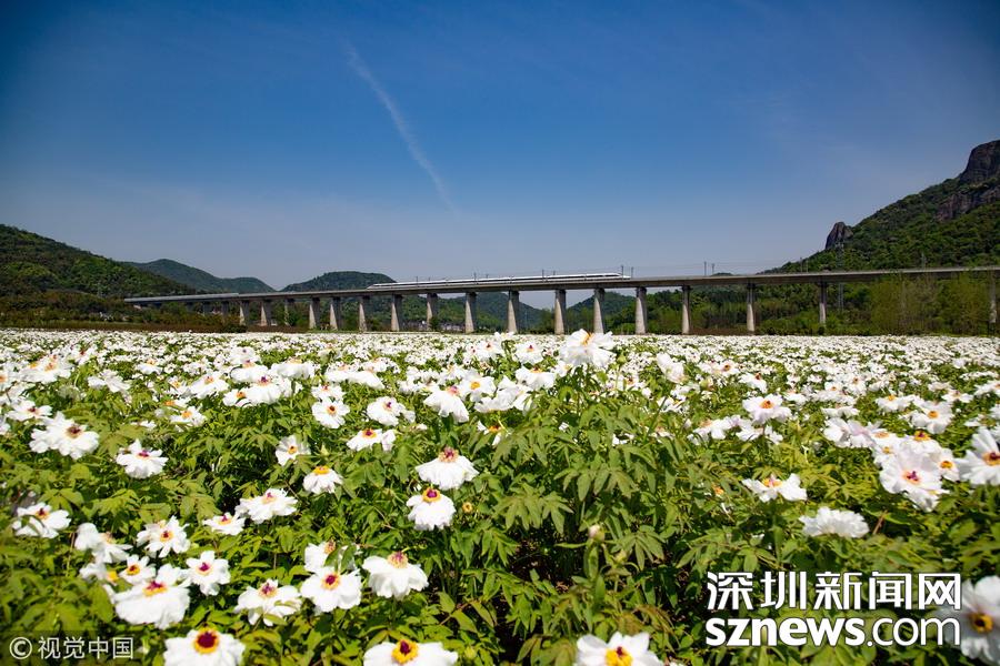 2019年4月8日,一列高鐵列車從京福高鐵安徽銅陵段一片盛開的鳳丹花海中駛過。隨著氣溫回升,安徽省銅陵市境內(nèi)的鳳丹競(jìng)相綻放,高鐵列車穿行其間,成為春日里一道美麗的風(fēng)景線。