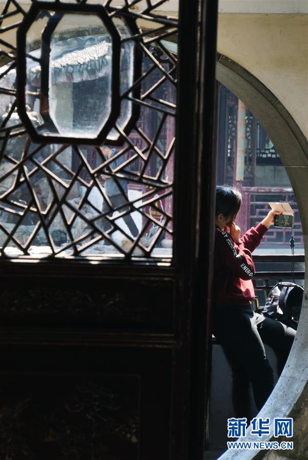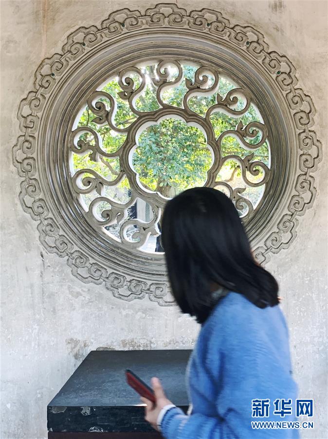 2019年4月1日,一名游客在中國蘇州耦園內(nèi)拍照。2000年,耦園和滄浪亭、藝圃、獅子林、退思園作為蘇州古典園林的擴(kuò)展項(xiàng)目被列入聯(lián)合國教科文組織世界文化遺產(chǎn)名單。 新華社記者杜涓涓攝