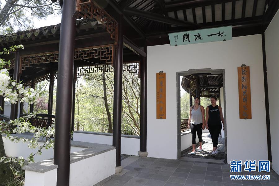 2017年4月28日,游客在美國紐約寄興園內(nèi)游覽。仿照中國蘇州園林設(shè)計(jì)建造的寄興園位于紐約斯塔滕島,占地面積約4000平方米,其所用的建筑材料大都在蘇州加工制造,并由40名來自蘇州的藝術(shù)家和工匠歷時(shí)6個月在紐約修建而成。 新華社記者王迎攝