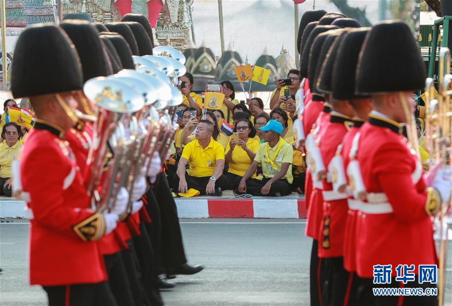 5月5日,儀仗隊(duì)在曼谷大王宮附近舉行的泰國國王加冕典禮巡游上列隊(duì)前進(jìn)。 新華社發(fā)(拉亨攝)