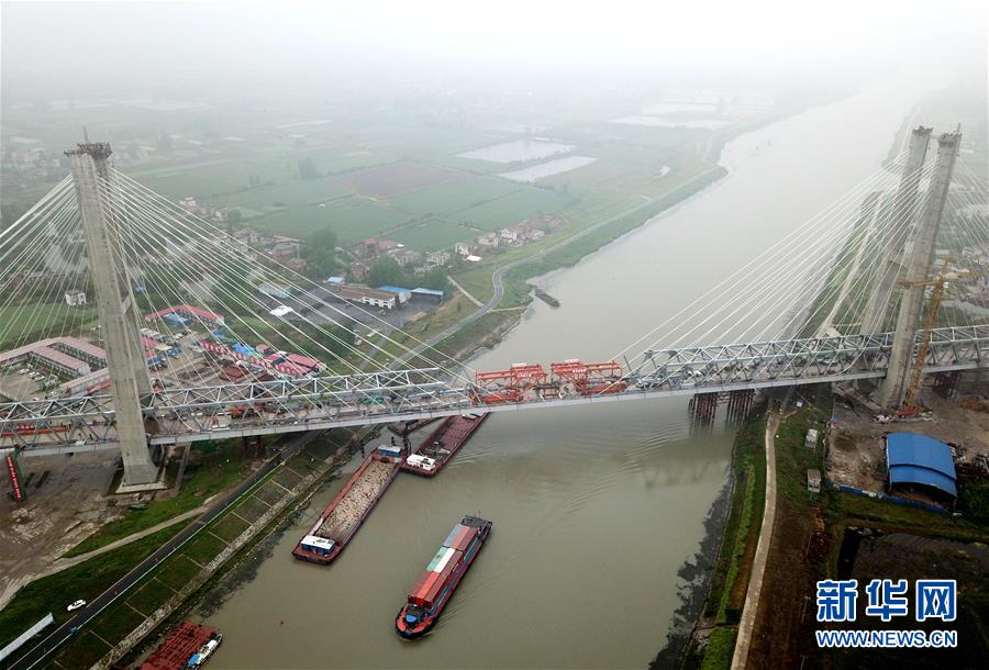 這是合龍后的商合杭鐵路裕溪河特大橋(4月22日無人機拍攝)。新華社記者劉軍喜攝