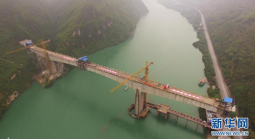 在重慶涪陵拍攝的渝懷鐵路涪秀二線重點工程——烏江右線大橋(10月23日無人機拍攝)。10月23日,由中鐵四局承建的渝懷鐵路涪秀二線重點工程——烏江右線大橋主跨成功合龍,標志著大橋主體工程全部順利結束。烏江右線大橋項目全程460.1米,主跨192米,跨越烏江和319國道。在兩年多的建設過程中,施工人員攻克了“不等高墩”“不對稱邊跨”“邊跨入隧”等多個技術難題。新華社記者王全超攝