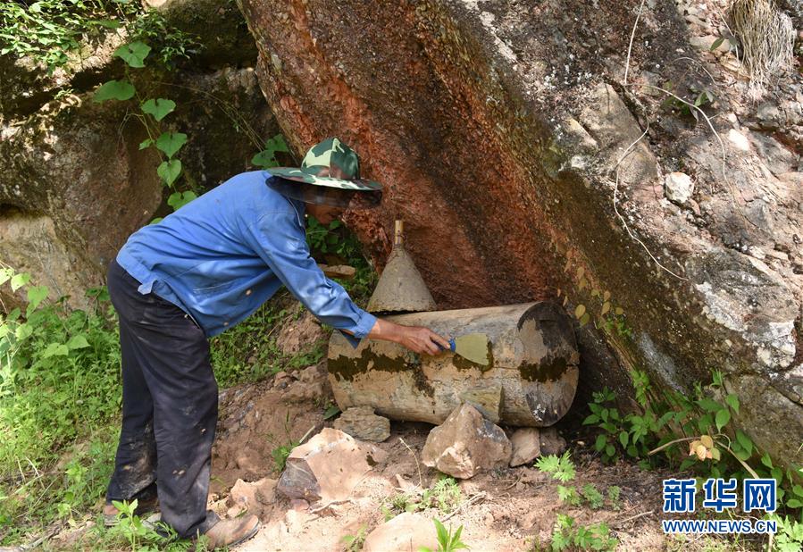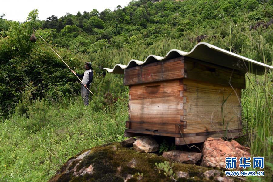 5月10日,在甘肅省隴南市徽縣大河店鎮(zhèn)硬灣村,蜂農(nóng)周仲頤在收蜂。 甘肅省隴南市徽縣大河店鎮(zhèn)硬灣村位于秦巴山區(qū)深處,2017年,在當?shù)卣姆龀窒?,龍崖老巢蜜養(yǎng)殖農(nóng)民專業(yè)合作社成立,蜂農(nóng)們將傳統(tǒng)養(yǎng)蜂技藝和現(xiàn)代加工方式相結(jié)合,并通過電商等渠道打開銷路,有效帶動了當?shù)刎毨Т迕衩撠氈赂弧D壳罢麄€合作社共有蜂箱2000余個,每箱每年可帶來三四千元的收入。 新華社記者 馬寧 攝