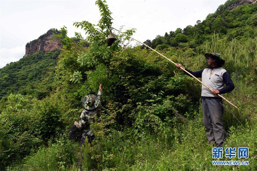 5月10日,在甘肅省隴南市徽縣大河店鎮(zhèn)硬灣村,蜂農(nóng)周仲頤(右)在收蜂。 甘肅省隴南市徽縣大河店鎮(zhèn)硬灣村位于秦巴山區(qū)深處,2017年,在當?shù)卣姆龀窒?,龍崖老巢蜜養(yǎng)殖農(nóng)民專業(yè)合作社成立,蜂農(nóng)們將傳統(tǒng)養(yǎng)蜂技藝和現(xiàn)代加工方式相結(jié)合,并通過電商等渠道打開銷路,有效帶動了當?shù)刎毨Т迕衩撠氈赂弧D壳罢麄€合作社共有蜂箱2000余個,每箱每年可帶來三四千元的收入。 新華社記者 馬寧 攝