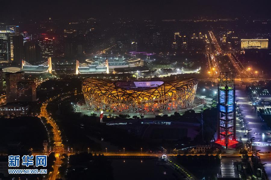 “鳥巢”燈光璀璨(5月14日攝)。 當(dāng)晚,一場“空間光影秀”在北京上演。 新華社記者 沈伯韓 攝