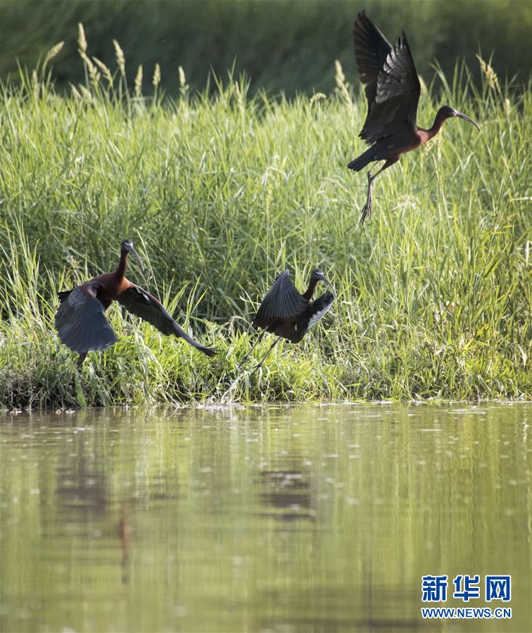 這是在漢江濕地公園飛翔的3只彩鹮(4月29日攝)。 近日,國(guó)家二級(jí)保護(hù)動(dòng)物彩鹮現(xiàn)身陜西省漢中市漢江濕地公園濂水河與漢江交匯處。 據(jù)陜西師范大學(xué)生命科學(xué)院教授于曉平介紹,彩鹮在世界上的分布比朱鹮還要少,這幾年在云南發(fā)現(xiàn)得多一些,這3只彩鹮現(xiàn)身漢江濂水河畔,是陜西首次發(fā)現(xiàn)彩鹮蹤跡。 據(jù)了解,彩鹮是國(guó)家二級(jí)保護(hù)動(dòng)物,屬鵜形目鹮科,體羽大部為青銅栗色,是珍稀鳥(niǎo)類(lèi)朱鹮的“近親”,體型比朱鹮略小。 新華社發(fā)(陶本耀 攝)