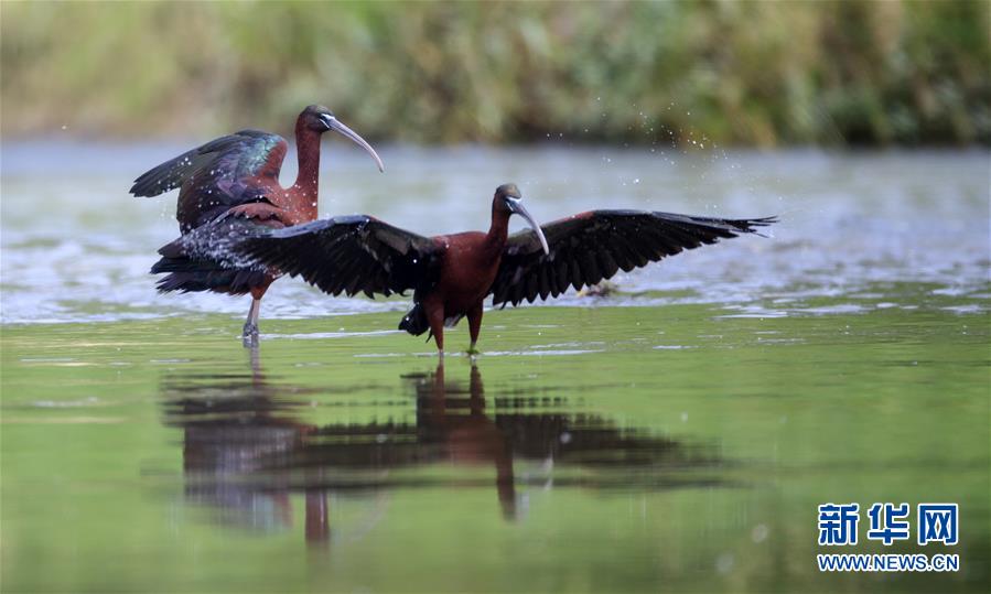 這是在漢江濕地公園嬉水的2只彩鹮(5月4日攝)。 近日,國家二級保護(hù)動(dòng)物彩鹮現(xiàn)身陜西省漢中市漢江濕地公園濂水河與漢江交匯處。 據(jù)陜西師范大學(xué)生命科學(xué)院教授于曉平介紹,彩鹮在世界上的分布比朱鹮還要少,這幾年在云南發(fā)現(xiàn)得多一些,這3只彩鹮現(xiàn)身漢江濂水河畔,是陜西首次發(fā)現(xiàn)彩鹮蹤跡。 據(jù)了解,彩鹮是國家二級保護(hù)動(dòng)物,屬鵜形目鹮科,體羽大部為青銅栗色,是珍稀鳥類朱鹮的“近親”,體型比朱鹮略小。 新華社發(fā)